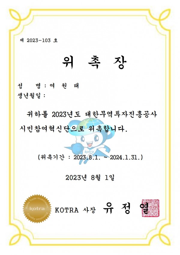 Letter of Appointment of KOTRA Citizen Participation Innovation Group 관련링크 mondereve 763 0 본문 Letter of Appointment of KOTRA Citizen Participation Innovation Group SHARE THIS PAGE 목록